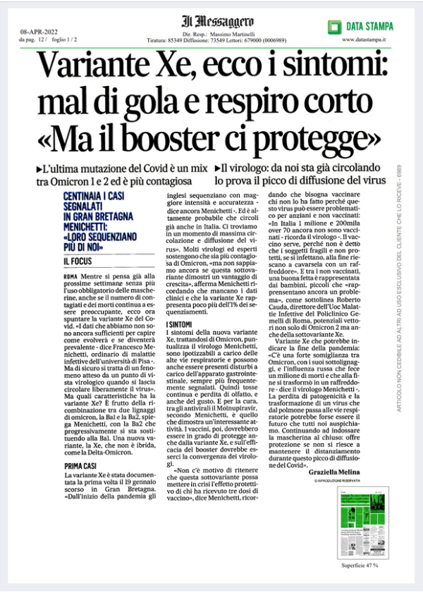 Mentre si pensa già alla prossime settimane senza più l'uso obbligatorio delle mascherine, anche se il numero di contagiati e dei morti continua a essere preoccupante, ecco ora spuntare la variante Xe del Covid. «I dati che abbiamo non sono ancora sufficienti per capire come evolverà e se diventerà prevalente - dice Francesco Menichetti, ordinario di malattie infettive dell'università di Pisa -. Ma di sicuro si tratta di un fenomeno atteso da un punto di vista virologico quando si lascia circolare liberamente il virus».