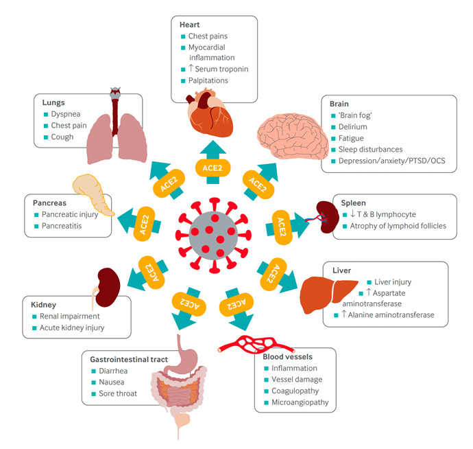 Multi-organ complications of covid-19 and long covid. The SARS-COV-2 virus gains entry into the cells of multiple organs via the ACE2 receptor. Once thhese cells have been invaded, the virus can cause a multitude of damage ultimately leading to numerous persistent symptomms, some of which are outline here.