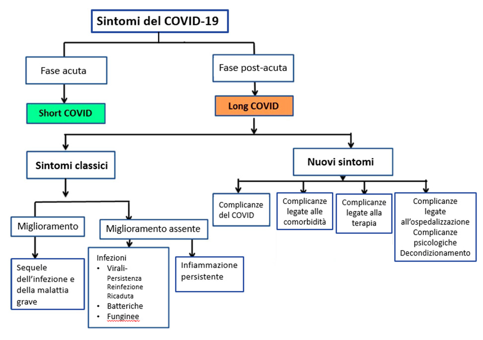 | Sindrome neuro-psichiatrica post-COVID | Cefalea, anosmia, difficolta neurocognitive, insonnia, depressione e altre patologie psichiatriche | Improvvisa comparsa di sintomi neurologici: vasculite, trombosi o demielinizzazione. Valutare in modo appropriato le condizioni psicologiche |