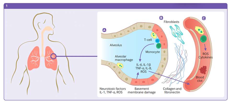(1) Negli alveoli polmonari: (A) L'infiammazione cronica provoca la produzione sostenuta di citochine pro-infiammatorie che vengono rilasciate nel tessuto circostante e nel torrente circolatorio. (B) Il danno endoteliale innesca l'attivazione dei fibroblasti, che depositano collagene e fibronectina, con conseguente fibrosi (C) Il danno endoteliale, l’attivazione del complemento e delle piastrine e l’interazione piastrine-leucociti, il rilascio di citochine pro-infiammatorie, l’alterazione delle normali vie della coagulazione e l’ipossia determinano lo sviluppo di un prolungato stato iperinfiammatorio e di ipercoagulabilità, aumentando il rischio di trombosi.