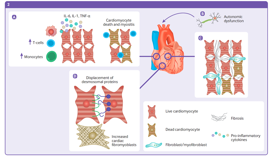 (2) Nel cuore: (A) l’infiammazione cronica dei cardiomiociti può provocare miosite e morte dei cardiomiociti. (B) La disfunzione dell'afferenza del sistema nervoso autonomo può causare complicazioni come la sindrome da tachicardia ortostatica posturale. (C) L’ infiammazione prolungata ed il danno cellulare provoca danni cellulari dei fibroblasti con conseguente fibrosi. (D) I cambiamenti fibrotici sono accompagnati da un aumento dei fibromioblasti cardiaci, mentre il danno alle proteine desmosomiali provoca ridotta adesione cellula-cellula.