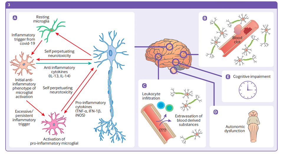 (3) Nel SNC: (A) La risposta immunitaria a lungo termine attiva le cellule gliali che danneggiano cronicamente i neuroni. (B) Lo stato iperinfiammatorio e di ipercoagulabilità aumentano il rischio di eventi trombotici. (C) Danni e disregolazione della barriera emato-encefalica si traducono in patologia della permeabilità, che consente alle sostanze derivate dal sangue ed ai leucociti di infiltrarsi nel parenchima cerebrale. (D) L'infiammazione cronica nel tronco cerebrale può causare disfunzione autonomica. (E) Gli effetti del Long Covid nel cervello possono portare a deterioramento cognitivo.