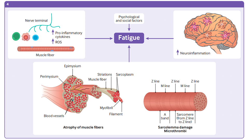 (4) Possibili meccanismi che causano la stanchezza post-covid-19. Una gamma di fattori centrali, periferici e psicologici possono causare il problema della fatica cronica nel Long Covid. L’infiammazione cronica nel cervello, così come nelle giunzioni neuromuscolari, può determinare la fatica cronica. I danni e l’atrofia delle fibre nel muscolo scheletrico, nel sarcolemma, possono svolgere un ruolo determinante nella fatica cronica, assieme a fattori psicologici e sociali